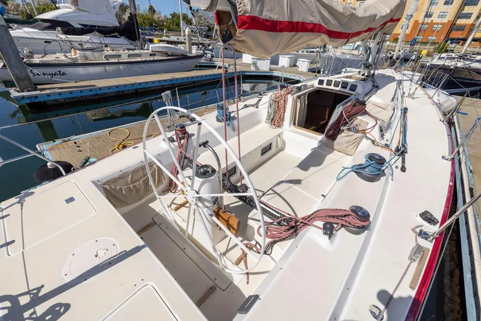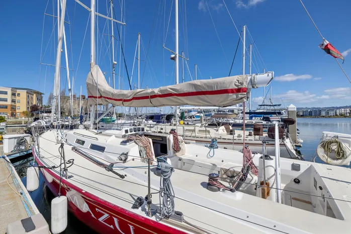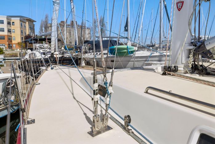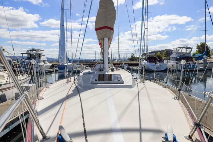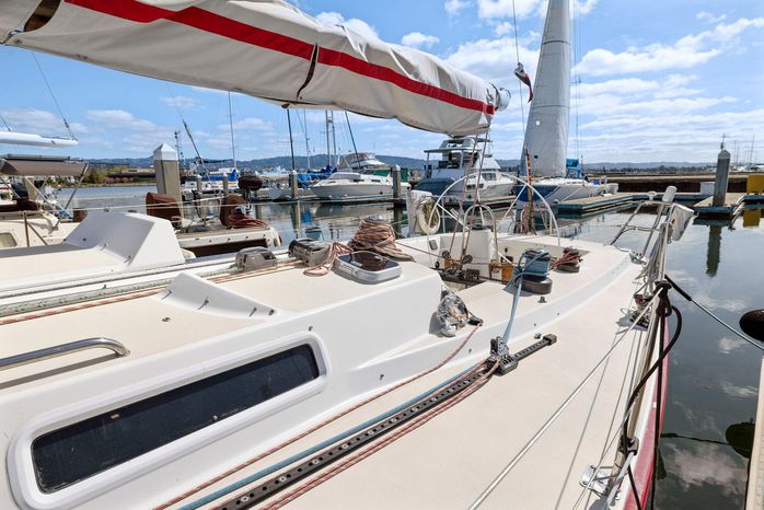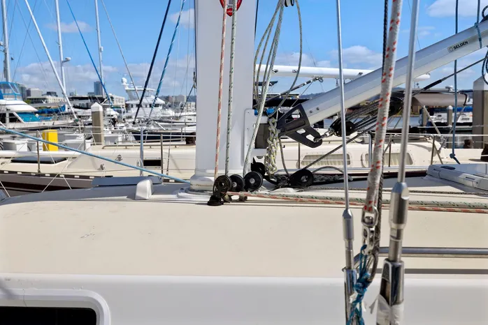 - Harken mast track with 13 ball bearing cars, easy hoist and drop. Lazy jacks