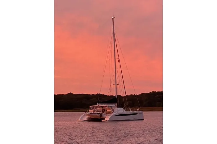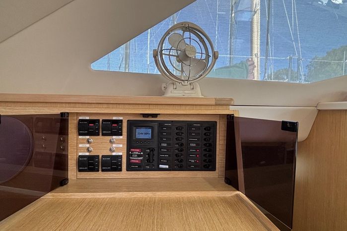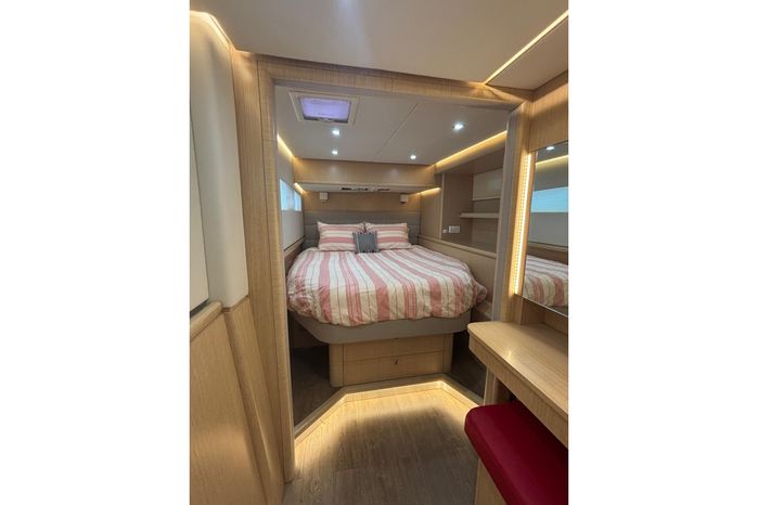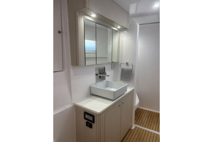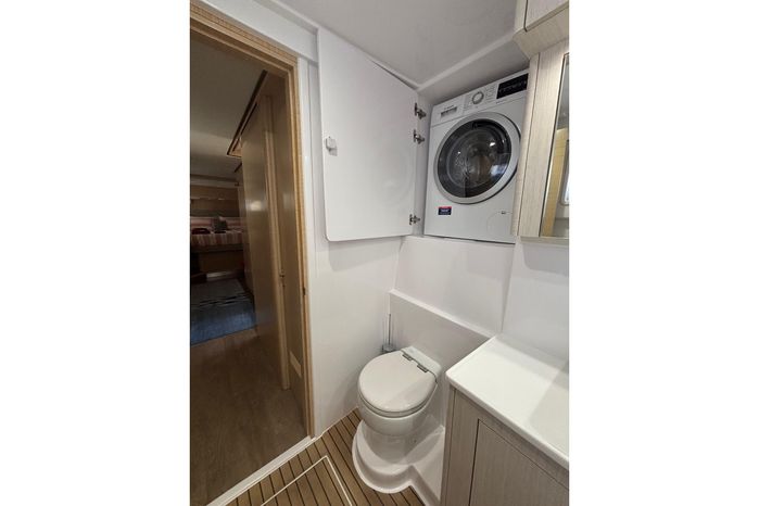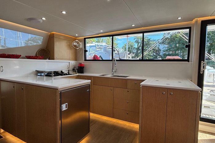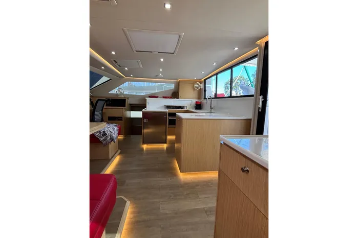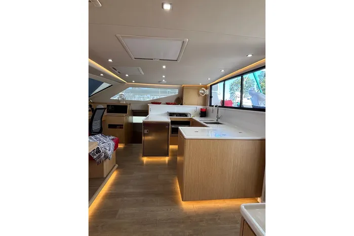 From the large aft cockpit you enter the spacious main saloon via large sliding doors. The main saloon has a large dining area and loads of storage to port with a sit down navigation station forward on the starboard side and a U-shaped galley to starboard. The starboard hull houses a spacious owners suite with large sleeping berth and head with shower. The port hull houses two guest staterooms and a shared second head.