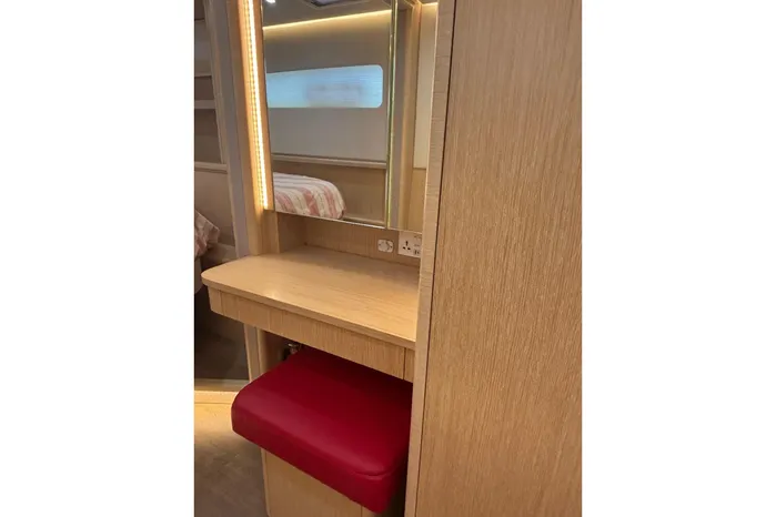 - Movable upholstered extension seating to navigation seat. Built-in wine storage.