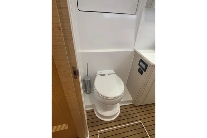 - Electric quiet flush toilet plumbed to fresh water. Discharge via holding tank.
